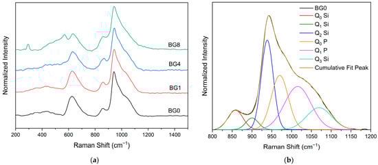 (a) Raman spectra of bioglass samples and (b) Deconvoluted Raman spectra of the BG0 sample.
