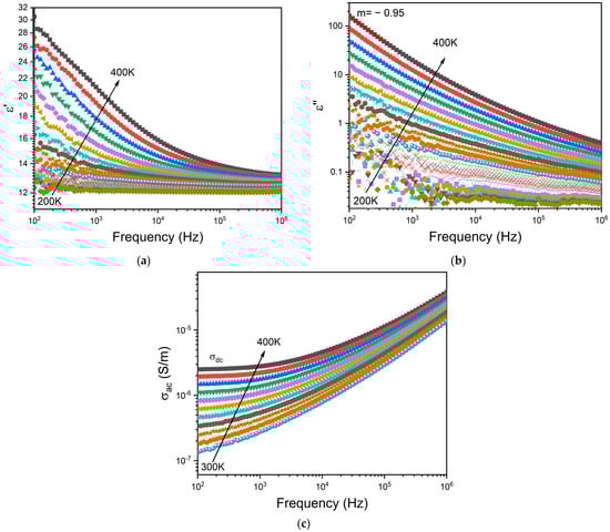 Figure 6a,b depict the frequency dependence of the dielectric permittivity ε′ and the loss factor ε″, respectively, for the BG2 glass. In this representation, the presence of dielectric relaxation behavior was not observed. In the high temperature and low frequency region, those variations show a linear increase with a slope of ε″ close to −1 (m = −0.95 at 400 K—Figure 5b) thus indicating the existence of the DC conductivity effect []. The frequency dependency of AC conductivity may be used to detect this effect. The appearance of a horizontal plateau at low frequencies correlates to the DC conductivity effect, as seen in Figure 6c.