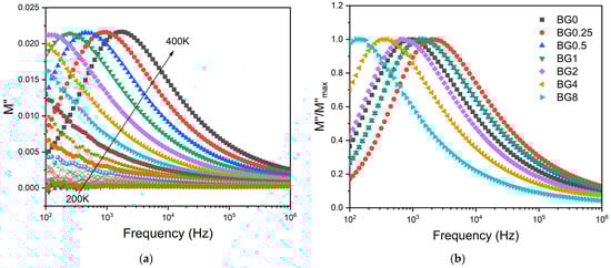 To minimize the electrode polarization and conductivity effects, the electric modulus (M* = 1/ε*) was used []. The presence of a dielectric relaxation was observed, whose maximum shifts to higher frequencies with the increasing temperature (Figure 7a). Thus, the relaxation behavior should be associated with the electrical dipole formed between the network modifier and NBO ions. Figure 7b shows a comparison of the normalized imaginary parts of the electric modulus M″/M″max as a function of frequency for the different CuO contents introduced into the bioglass network.