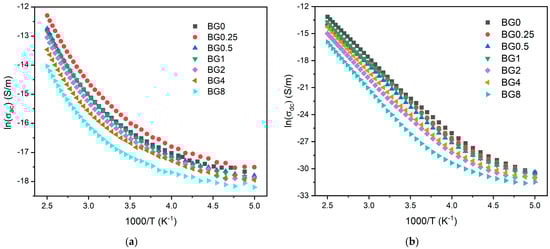 Figure 8a,b display the AC and DC conductivity, in logarithmic scale, versus 1000/T, respectively. For all the samples, an increase in temperature is related to the increase in the charge carriers’ mobility, and at the high temperature range, this variation becomes linear. This behavior shows that the conductivity is a thermal-activated process and can be analyzed using the Arrhenius formalism (Equation (4)). Thus, the calculated activation energies for both AC and DC conductivity are presented in Table 2.