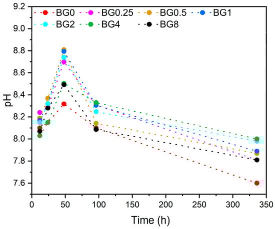 It is noted that from the first few hours, the pH level increases compared to the initial pH of the SBF medium, which was 7.4. This increase in pH continues up to 48 h, then it decreases with increasing immersion time. It is worth noting that the SBF medium was changed every 48 h to simulate the physiological condition. The decrease in pH level can be ascribed to the development of the apatite layer on the bioglasses’ surface [].