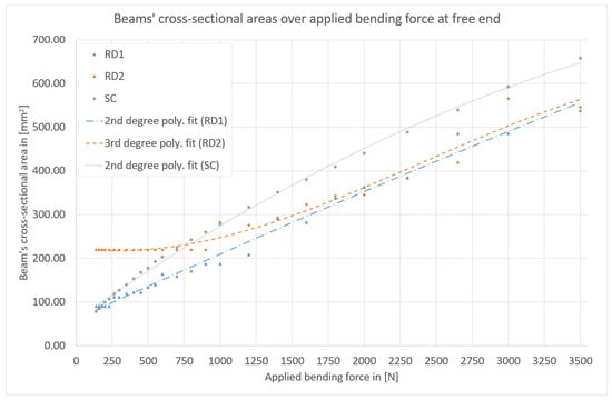 Numerous specific bending loads were considered, namely 26 different values for the bending load between 14 and 350 Nm. The optimization goal was to minimize the cross-sectional areas of the beams (as a proportional measure of their mass) while sufficiently supporting the loads without exceeding the yield strength of the material anywhere inside the beam. All optimizations were carried out considering the constant lengths of all beams of lB = 100 mm.