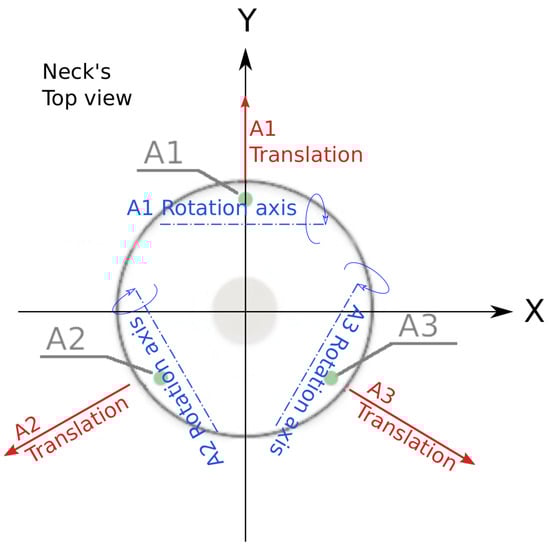 The soft neck, shown in Figure 3, consists of an thermoplastic elastomer (TPE) central soft link resembling a spine, and a parallel mechanism driven by cables (acting as tendons), which produce a tilt in the upper platform that can be measured by the attached IMU. The three tendons are evenly spaced, showing a separation of between each other (see Figure 4).