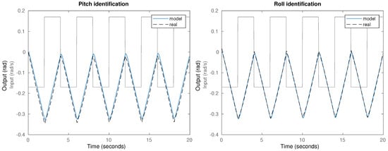 The results obtained during the identification process are shown in Figure 5, including the input data (square signal), the measured plant output (real) and the simulated response (model) for the pitch () and roll () plant models.