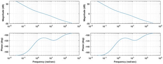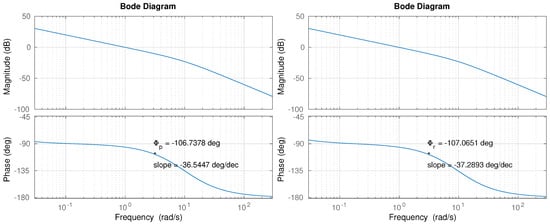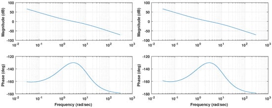 The Bode diagram shown in Figure 8 displays how the resulting controllers meet the specifications proposed. Coincident with the 3 rad abscissa, values of 0 dB for the magnitude and a phase margin of 50 deg are observed, which implies that both loops fulfill the desired specifications. A zero phase slope can also be found at the crossover frequency, as expected from the iso-m tuning method description. This flat phase around the crossover frequency guarantees a constant phase margin (and therefore a constant overshoot behavior) around its nominal value, providing system robustness [].