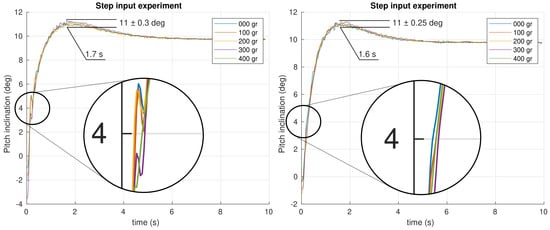 The first impression is that both systems are quite robust to mass changes. The curves show that overshoots are really similar as expected from the specifications. Stability is excellent despite the different masses applied in the fractional controller case, and a slightly faster response ( vs. ) compared to the PID controller can be observed. In the PID case, a worse robustness behavior can be observed. Note the higher overshoot variation and the glitch between and (see Figure 13). Although the robustness is quite good in both controllers, making the curves overlap, a detailed study of the results show that the PID unstable behavior increase with the mass, unlike the FOPI controller which keeps the same stability parameters throughout the entire experiment.