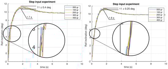 Following the same procedure for the roll plant model, the controller parameters , , were found. A summary with all the controller parameters is shown in Table 2.