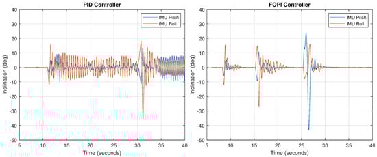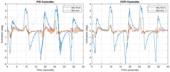 Although both systems give roughly similar results, a closer look at the figure shows that PID stability is much worse, leading to sustained oscillations, indicative of an almost exhausted phase margin, which is to be expected in view of the Bode diagrams shown in Figure 7. The mass increase produces a lower loop gain that shifts the crossover frequency towards lower abscissa values, where a much smaller phase margin is available, making the system less stable. The FOPI controller performance is much cleaner, without notable oscillations. Note that the largest error () only lasts several seconds, and its value is three times lower than the tilt caused by the trunk ().
