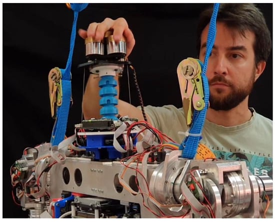 The other approach found in the literature is bioinspiration, which seeks to mimic the solutions found in nature to solve this problem. For instance, birds [], horses [], monkeys [], even small vertebrates [], and humans [,,] use the same strategy to solve the head stabilization problem. In all these cases, the main corrective action is to perform an opposite motion with the neck in order to cancel the perturbations and maintain the head in a relatively similar inclination. The equilibrium sensors, often located in the head, provide a reference allowing the subject to maintain its head horizontally (and therefore their vision systems) no matter their body positions. The evidences found in these works suggest that head stabilization has an impact in the performance of recognition, tracking and locomotion in the case of these animals, and the bioinspiration approach suggests that it can also be useful in the case of legged robots vision systems. Most authors agree that vertical rotation is typically less critical in terms of the robot’s visual sensory inputs stability, while managing horizontal disturbances plays a vital role in maintaining consistent imagery and facilitating accurate visual processing.