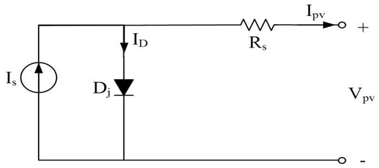 PV cells are composed of multiple P–N junction semiconductors. Illustrated in Figure 1 is an equivalent circuit representing PV cells. This model includes a current source Is, a parallel diode Dj, a series resistance Rs, a PV output current Ipv, and a PV output voltage Vpv. The output current can be represented by Equation (1), where k is the Boltzmann’s constant, n is the ideality factor, T is the temperature in Kelvin, q is the electron charge, and Id is the saturation current. Thus, the output power of the PV cells can be obtained as Equation (2). Figure 2 shows the Power–Voltage (P–V) curve of PV cells, which is a nonlinear curve due to the MPP.
