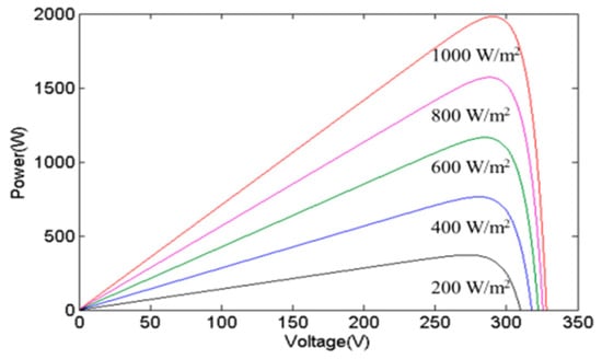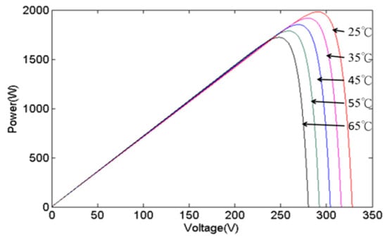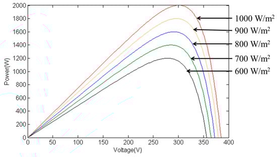 The inherent limitations of individual photovoltaic (PV) cells, such as their low output voltage and current, render them impractical for direct application. Consequently, PGSs typically consist of several PV cells to raise the output current and voltage. The power curve of a PGS will vary due to changes in irradiance and temperature. Figure 3 and Figure 4, respectively, show the changes in the power curve of a PGS when affected by irradiance and temperature. When irradiance changes, the maximum power sharply decreases as irradiance decreases, while the MPP voltage only shifts slightly to the left and decreases. When the temperature changes, the maximum power decreases as temperature increases, and the MPP voltage shifts to the left and becomes smaller. These observations underscore the significant influence of irradiance on the output power of a PGS, as elucidated by the depicted data in Figure 3 and Figure 4.