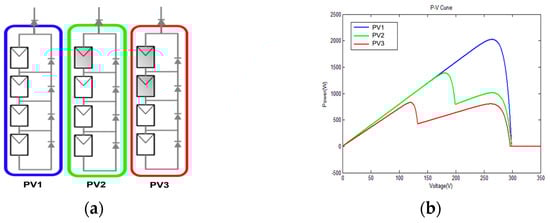 In a PGS, if some PV cells are shaded, resulting in the decreased power generation of certain PV panels, connecting them in series and parallel with unshaded PV panels can lead to multi-peak conditions in the overall power curve. Figure 5a illustrates a schematic diagram of the photovoltaic panels under different shading conditions. Blue indicates no shading, green indicates a small amount of shading, and red indicates significant shading. Subsequently, Figure 5b presents the resultant power curve derived from the configurations outlined in Figure 5a. When the PV panels are completely unshaded, the power curve of the PGS exhibits a single blue peak. Conversely, when a small part of the PV panels is shaded, the power curve of the PGS shows a green double peak. In scenarios where shading predominantly impacts most of the PV panels, the resulting power curve assumes a red multi-peaked characteristic. Based on the above, effectively operating the PGS at the maximum power point under different conditions due to irradiance, temperature changes, and partial shading poses a challenge for the MPPT approach in terms of both speed and accuracy.