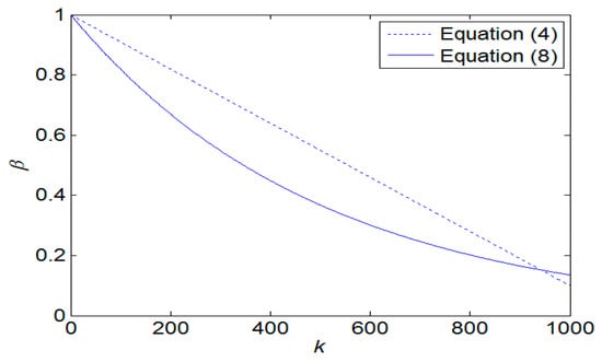 Moreover, the significance of the optimal solution of the particle swarm increases with the progression of iterations. In the current QPSO algorithm, Equation (5) solely employs random variables to strike a balance between the optimal solution of individual particles and that of the particle swarm, without adjusting its weight with the iteration count. Consequently, this approach may predispose the algorithm towards convergence to a local optimal solution, thus failing to achieve the global optimal solution. To rectify this limitation, this paper leverages the characteristic of the decreasing β parameter as the number of iterations increases. Equation (5) is amended to Equation (9), wherein the range of the random variable is adjusted to [0, β] to enhance the weighting of the optimal solution of the particle swarm in the later stages of the algorithm.