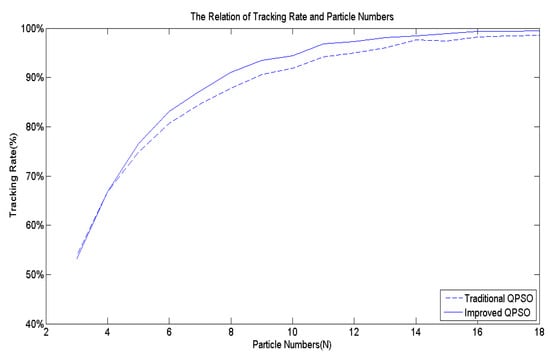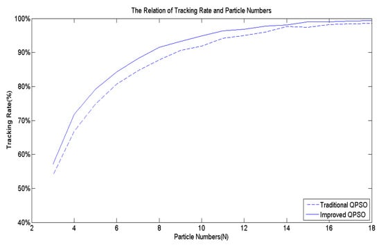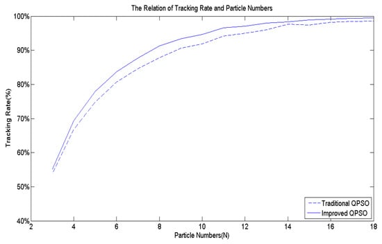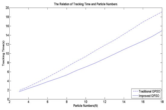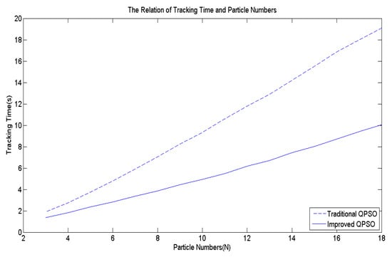 Building upon the insights, this paper devises an improved QPSO algorithm, incorporating Equations (3) along with Equations (8) to (11), thereby enhancing the tracking accuracy and speed of the proposed biomimetic method. Figure 7 serves as the benchmark multi-peak objective function to contrast the IQPSO algorithm with the QPSO algorithm, with set to 20. Through 10,000 simulation iterations, the tracking time and success rate are illustrated in Figure 12 and Figure 13, respectively. The findings conclude that the proposed IQPSO algorithm surpasses the existing QPSO algorithm and is better suited for intricate search and tracking tasks.