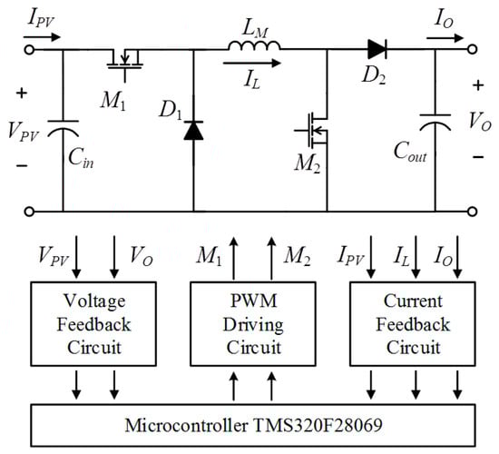This paper employs a series buck-boost converter for MPPT in a PGS. Figure 15 shows the circuit diagram of the series buck-boost converter along with its associated peripheral circuits. Table 1 presents an overview of the specifications of the MPPT circuit. The series buck-boost converter comprises a buck converter and a booster converter, regulating the power switch M1 into buck mode and the power switch M2 into boost mode, respectively. Upon receiving the signals Vpv and Ipv from the feedback circuits, the microprocessor TMS320F28069 calculates the duty ratio using the IQPSO program stored within the chip. Based on the calculated duty ratio, the corresponding pulse width modulation (PWM) signal drives the insulated gate bipolar transistor (IGBT) power switch in either buck mode or boost mode, maximizing the output power of the PGS.