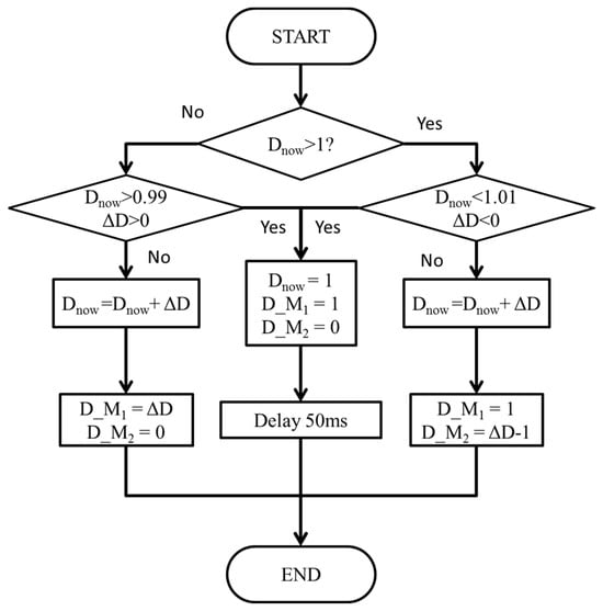 To search for the MPP under varying irradiance and temperature conditions, the MPPT circuit must switch between buck and boost modes. In this paper, the duty ratio of the power switch is designed as the particle position, distributed within the range of [0, 2]. Specifically, the particle position [0, 1] indicates that the MPPT is operated in buck mode, wherein the duty ratio ranges from 0% to 100%. Conversely, the particle position [1, 2] signifies that the MPPT is operated in boost mode, with the duty ratio ranging from 0% to 100%. Figure 16 depicts the flowchart illustrating the mode conversion process. The symbol Dnow represents the current particle position of MPPT, while ΔD represents the change step of the duty ratio. Additionally, the symbol D_M1 denotes the duty ratio of the power switch M1, and D_M2 denotes the duty ratio of the power switch M2. Throughout the MPPT mode switching process, D_M1 is set to 1, D_M2 is set to 0, and a delay of 50 ms is implemented to stabilize the input voltage before transitioning modes to reduce surges.