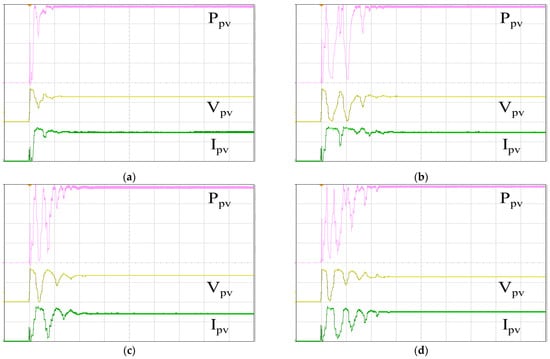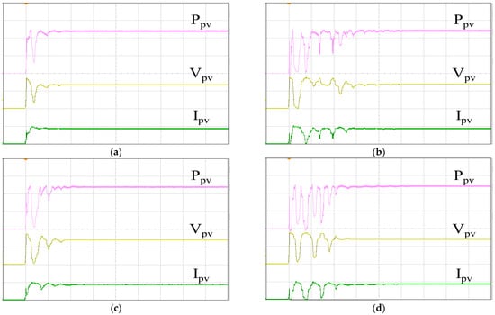 MPPT responses of the single-peak P–V curve: (a) IQPSO; (b) QPSO; (c) FA; (d) PSO (Ppv: 500 W/div, Vpv: 200 V/div, Ipv: 5 A/div, time: 2 s/div).