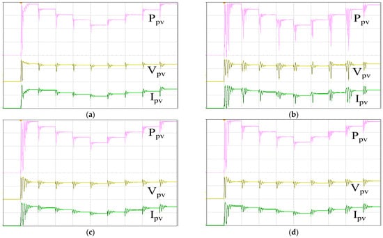 MPPT responses of the PV arrays under multi-peak conditions: (a) IQPSO; (b) QPSO; (c) FA; (d) PSO (Ppv: 500 W/div, Vpv: 200 V/div, Ipv: 5 A/div, time: 2 s/div).