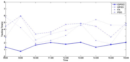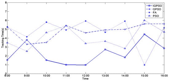 The values of irradiance and temperature vary depending on the relative position of the sun and the PV arrays. To compare the MPPT performance using the four biomimetic algorithms under varying irradiance and temperatures, full-day experiments were conducted from 8 a.m. to 4 p.m. MPPT measurements were taken every hour, and the currently measured power represents the maximum generated power of the PV arrays for that hour. Figure 28, Figure 29, and Figure 30 illustrate the tracking time of the full-day MPPT measurements on the first, second, and third days, respectively. Table 10 presents the maximum power generation output of the PV arrays over three days. From these charts, it is evident that utilizing IQPSO for MPPT consistently results in achieving the maximum power generation output and the fastest tracking time each day throughout the three-day period.