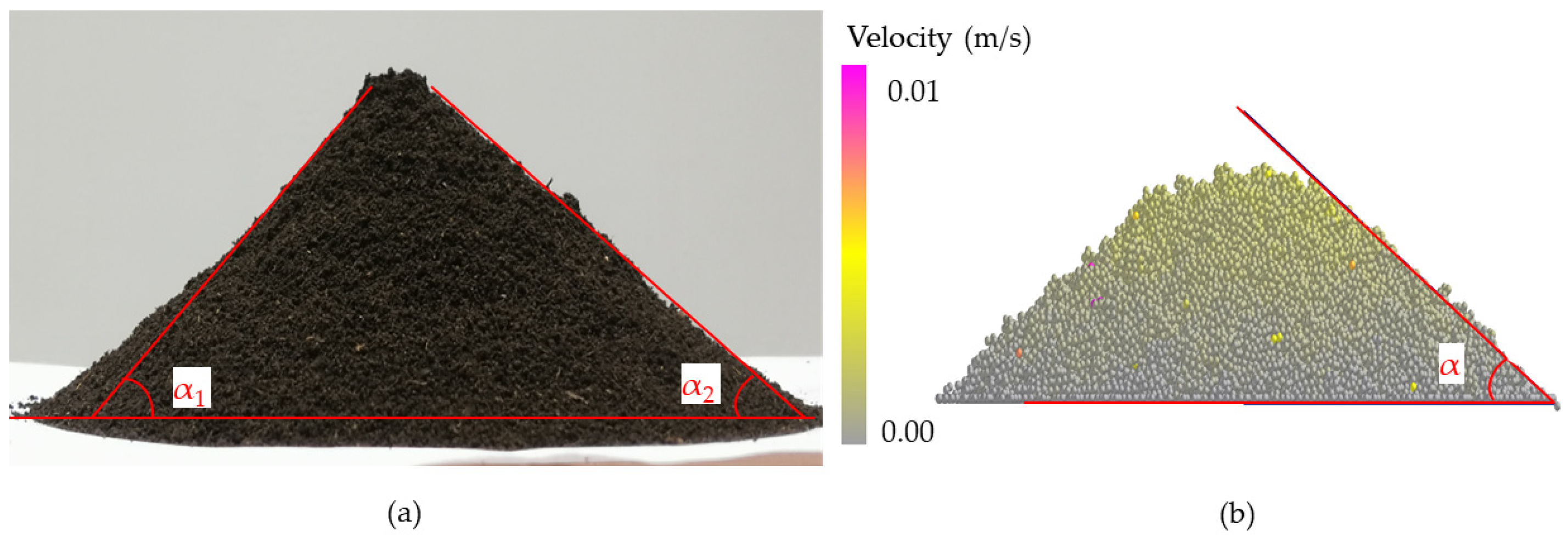 - Yang, Q.; Shi, L.; Shi, A.; He, M.; Zhao, X.; Zhang, L.; Addy, M. Determination of Key Soil Characteristic Parameters Using Angle of Repose and Direct Shear Stress Test. Int. J. Agric. Biol. Eng. 2023, 16, 143–150. [Google Scholar] [CrossRef]