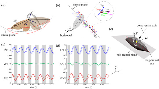 From the reconstruction, we quantified the wing kinematics. A coordinate system was fixed at the wing root, and the kinematics were measured with respect to the mean stroke plane. The stroke plane was defined as the least-squares reference plane that passed through the centroid of the points of the wing root and tip coordinates. We averaged the stroke plane for all complete wings beats to obtain the mean stroke plane. The Euler angles of flap (ϕ), deviation (θ), and pitch (ψ) define the rigid wing orientation relative to the stroke plane (Figure 2a). ϕ refers to the forward and backward motion of the wing projected on the stroke plane. The up and down rotation with respect to the mean stroke plane is expressed by θ. ψ is the angle between the wing chord and the mean stroke plane. ψDS is less than 90° and ψUS is greater than 90° in our definition. The geometric angle of attack (AoA) (αgeom) is the angle between the wing chord and flapping velocity, while the effective AoA (αeff) is the angle between the wing chord and the vector sum of the body and wing velocities (Figure 2b).