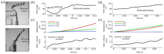 The body kinematics of the selected cicadas are shown in Figure 4. CCD #1 initiated flight voluntarily and flew upward and forward during the preparatory phase, as indicated by the transparent images in Figure 4a(i). Afterward, the cicada pitched its body to a steep angle, slowed down, and initiated backward flight. The cicada flew for approximately six flapping strokes in a relatively straight path with a mean body angle () of 122° before leaving the view of one the cameras (Figure 4a(i),b). The average backward velocity () was −1 m/s as the insect flew in a flight angle of about 15° relative to the horizontal plane (Figure 4c). CCD #2 also initiated flight voluntarily, albeit via a jumping takeoff. Its initial body angle was 86°, which increased to 130° by the end of the flight (Figure 4d). This cicada flew for approximately four flapping strokes with a of −0.94 m/s and increased its altitude by an angle of about 50° relative to the horizontal plane (Figure 4e). The advance ratio (J), which is defined here as the ratio of the average resultant body velocity to the wingtip velocity, was about −0.2 for both cicadas.