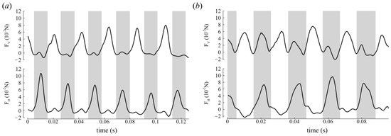 Time history of force production in the global frame of (a) CCD #1 and (b) CCD #2. FV—vertical force and FH—horizontal force refer to the forces in the Y and X directions, respectively (see Figure 2a). Gray shading denotes the DS.