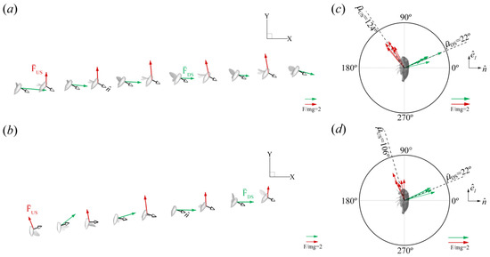 In the global frame, the half-stroke-averaged aerodynamic force vectors presented are in the X-Y plane, where most of the body motion occurred (Figure 7a,b). The green arrows and red arrows represent the DS average () and US average force vectors (), respectively. The US forces point upward (+Y direction), while the DS forces point backward (+X direction). Measured relative to the horizon (+X direction, Figure 2), and were oriented at −6 ± 4° and 96 ± 5° for CCD #1, and at 14 ± 18° and 97 ± 10° for CCD #2, which indicates, in the global frame, predominantly vertical force generation during the US and horizontal force generation during the DS.