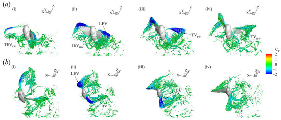 Large coherent structures with strong vorticity around the wing’s surface were identified. An LEV (a region of low pressure, shown in blue) was formed shortly after the half strokes (Figure 8a(i),b(i)) and remained attached for the duration of each half stroke, shedding at the stroke reversal. The size of the LEV in both half strokes was similar, qualitatively indicating that comparable amounts of force were generated which is corroborated by the force measurements shown in Figure 6. Other vortex structures such as a trailing-edge vortex, tip vortex, and root vortex were also evident. Most of the large vortex structures emanated from the FWs, which may indicate the auxiliary role that the HWs play in force production during flight.