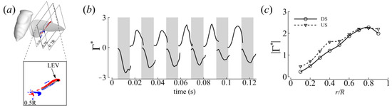 To measure the strength of the LEV, two-dimensional (2D) planes perpendicular to the rotation axis of the LEV were placed along the wing at every time step of the numerical simulation (Figure 9a). The vorticity () was calculated on this 2D plane by taking the curl of the velocity. The area of integration (S) was identified by a vorticity threshold set at 10% of the maximum spanwise vorticity. Subsequently, the non-dimensional circulation was obtained using Equation (3).