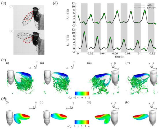 Cicadas have two pairs of wings, of which the HW pair is the smaller. The HW is attached to the FW in flight to form a functional two-winged flight apparatus (Figure 10a). Functionally coupling the FW and HW together is thought to eliminate the conflict between the wing pairs [47]. Here, we quantified the contribution of each wing pair to force generation. We compared two simulation cases: (i) ALL (FW+HW) and (ii) FW only (FO). An HW only (HO) case was not simulated because the flow cannot separate at the leading edge of the HW where it is connected to the FW’s trailing edge.