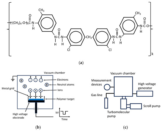 (a) The PU formula and (b,c) scheme of the plasma system. (b) The scheme of the plasma chamber with a high voltage electrode, grid, and polymer sample (blue rectangular). The plasma is generated during a short, high-voltage pulse. Ions from plasma are accelerated towards the polymer surface. (c) A block scheme of the system, including vacuum pumps, gas line, high voltage generator, and sensors of pressure, voltage, current, and plasma spectrum (marked as measurement devices).