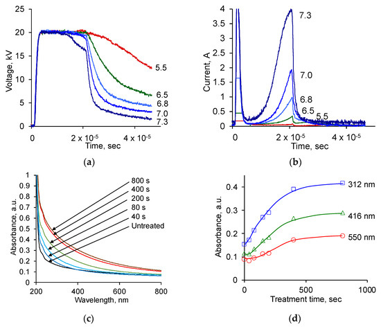 (a) Voltage oscillogram during pulses at different pressures (marked in mTorr) in a vacuum chamber; (b) current oscillogram during pulses at different pressures (marked in mTorr) in a vacuum chamber; (c) UV spectra of PE films treated for various durations (for fluence calculation) (see in text); (d) UV spectra absorbance of PE films at different wavelengths to determine the fluence of ion beam treatment (for fluence calculation) (see in text).