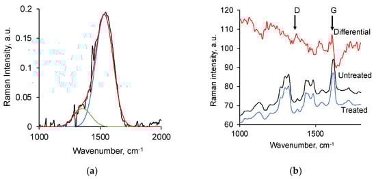 Micro-Raman spectra of (a) PE treated by an ion beam, black line is the experimental spectrum, green line is D-peak, blue line is G-peak, red is their sum; (b) untreated PU, treated PU by an ion beam and their difference.