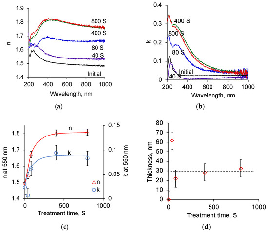 Optical ellipsometry spectra and results of ion beam treated PU: (a) spectra of the refractive index of the top layer for different treatment time (marked in s); (b) spectra of the extinction coefficient of the top layer for different treatment time (marked in s); (c) refractive index and extinction coefficient of the top layer in dependence on treatment time; (d) thickness of the top layer in dependence on treatment time.