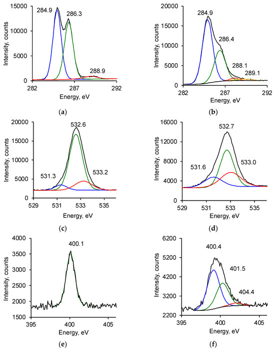 The spectra of the treated PU showed significant differences. The total nitrogen content increased, and the total oxygen content decreased markedly (Figure 7). The total carbon content did not change, but the carbon content in the carbon–carbon bonds increased from 51.5% to 62.4%. The ether groups’ carbon and oxygen content decreased significantly (Figure 7). The carbon and oxygen content in carbonyl groups increased. New lines of nitrogen in unsaturated double (401.5 eV) and triple bonds (404.4 eV) with carbon atoms appeared. The concentration of elements, calculated by the intensity of these lines, no longer corresponded to the structural formula of PU.