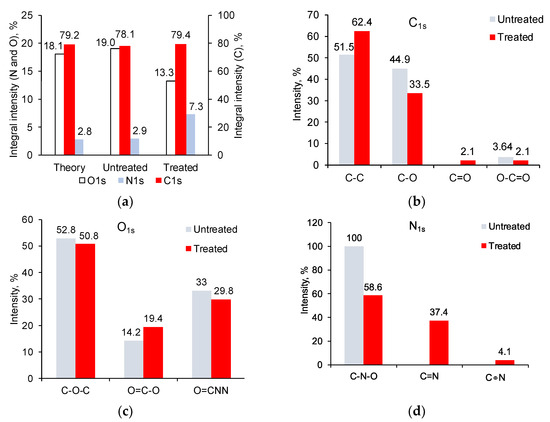 The element content of untreated and treated PU surface provided by XPS data: (a) total content; (b) content of carbon atoms in different bonds by high-resolution C1s line; (c) content of oxygen atoms in different bonds by high-resolution O1s line; and (d) content of nitrogen atoms in different bonds by high-resolution N1s line.