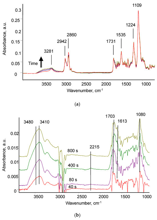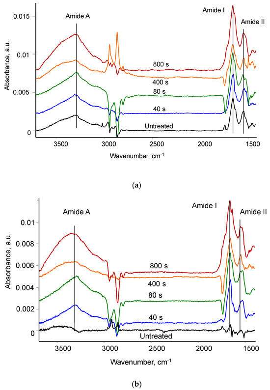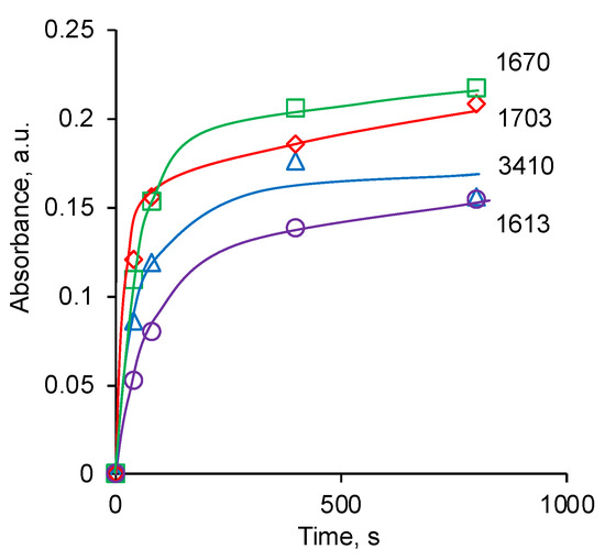 For quantitative measurements of spectral line intensity, the method of internal standard was used (Figure 9). For this purpose, the intensity of the 3410 cm−1 new vibration line of the hydroxyl group was normalised to the intensity of the 2859 cm−1 line of methyl groups of PU. The intensity of 1703 cm−1, 1670 cm−1, and 1613 cm−1 new vibration lines of unsaturated groups was normalised to the intensity of line 1534 cm−1 vibrations of Amide II of PU. This intensity normalisation made it possible to take into account the quality of the optical contact of the PU sample with the ATR crystal. For all new lines analysed, an asymptotic dependence of the intensity of these lines on the treatment time was observed. After 400 s of treatment, the increase in the intensity of new lines practically stopped within the standard deviation range.