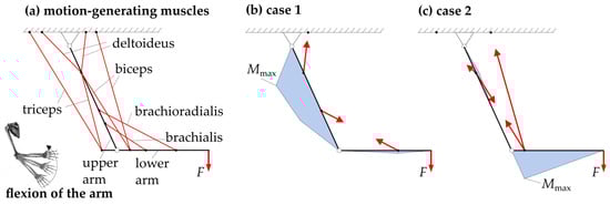 The flexion of the human arm is generated by a greater number of muscles than kinematically necessary (as simplified with biceps and triceps, the brachioradialis and brachialis, and the deltoideus in Figure 1a). From a technical point of view, the following two theoretical (non-physiological) cases for generating movement would be possible. Although they do not correspond to the biologically correct flexion of the arm, they demonstrate well the principle of tension chording. In case 1, shown in Figure 1b, the arm is flexed by the action of the deltoid and the brachioradialis. The bending moment distribution, which is also shown in blue, indicates that the resulting bending moments in the upper arm are maximum, while they are minimum in the lower arm. In case 2, see Figure 1c, the deltoideus and the biceps act in contrast, whereby the circumstances of the bending are reversed, as can be deduced once again from the bending moment distribution. Thus, the bending moments in the upper arm become minimal, while they become maximal in the lower arm. Any other combination of muscles and also the strength of the forces can in turn produce different bending moment distributions along the upper and the lower arm. According to the tension chording principle of Pauwels [9], the human sensorimotor system finds an adapted muscular interaction, which allows an overall minimization of bending stresses [14] and, thus, homogenizes the stress in the bone spatially and temporally, saving mass and resources [5,6,7,9,15,16,17,18]. This optimal interaction was proven among other things by electromyography (EMG) measurements [19].