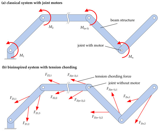 Kinetic model consideration of a kinematic chain in the case of motion generation with joint motors (a) and with redundant actuators with linear actuators (b). M are moments in the technical joint, and F are forces of the linear actuators. Index n denotes the segment (beam structures) according to [35].