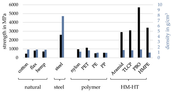 Besides simple polyamide fibers, there are so-called high-modulus–high-tensity (HM-HT) fibers, which were developed using aramid. Modern HM-HT fibers use, among others, high-modulus polyethylene (HMPE) or synthetic high-performance polymers (PBOs). According to ROST [61], tensile strength and abrasion resistance are the most important properties for the selection of ropes due to their significant effects on the potential of a rope pull with synthetic fibers. Figure 3 shows the tensile strengths of different types of ropes.