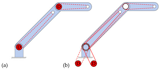 Another important issue for the implementation of the tension chording principle with redundant motion generation by means of ropes concerns the position of the drives of the rope pulls. They can be mounted outside the moving elements (e.g., on the floor, ceiling, or housing) (see Figure 4b) or can be attached along with the moving elements, e.g., in the joints (see Figure 4a, where the lower drive is attached to the floor). The first situation is advantageous in terms of the moving mass, which can be kept low. However, this requires many rope deflections and guides, which in turn introduce loads into the structure through, among other things, joint forces, which counteract the actual tension chording. Whilst it is often possible to avoid this by attaching motors to the moving elements, the increased moving masses introduce bending moments due to inertia, which is not desirable. Since both moving and static motors are not similar to the biological model, no general statement can be made here on the implementation of bending minimization by the tension chording principle in technical applications, and it must be carefully evaluated in which case the undesired bending moments can be tolerated better, which occur by the drive and the rope guide. Finally, it should be noted that the above-mentioned problems do not apply to shape memory alloys used as ropes [51], though they appear unsuitable for use in an adaptive system, particularly due to their high actuating times.