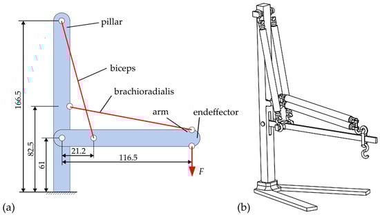 The kinematic design is based on the kinematics of the upper and lower arms shown in Figure 1. In contrast to the biological upper/lower arm system, the geometric dimensions in this demonstrator design are scaled proportionally (approximately 1:4, see dimensions in Figure 5a). Moreover, not all muscles acting on the arm are used, but only two muscles are used as actuators, which take over the functions of the biceps and the brachioradialis in analogy to Figure 1. The arm, which is bending minimized by the tension chording, is the beam labeled “arm” in Figure 5a. The “pillar” takes over the task of the articulated support of the arm and the mounting of the two actuators. Each of the DEAs are articulated and thus connected torque-free to the arm and the pillar. The demonstrator is additively manufactured almost entirely from the material PLA (polylactic acid). The arm as a beam is made of PC (polycarbonate) in order to make the influence of the tension chording visible with the use of photoelasticity, see Figure 6b. Figure 6a shows the physical demonstrator with a load F resulting from a mass of 25 g at the end effector of the arm and the resulting stresses in Figure 6c, visualized by the photoelasticity.