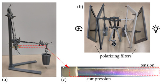 Overall view of the manufactured artificial muscle demonstrator (a), the photoelasticity setup (b), and the detailed view of the loaded PC arm (c).