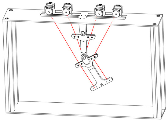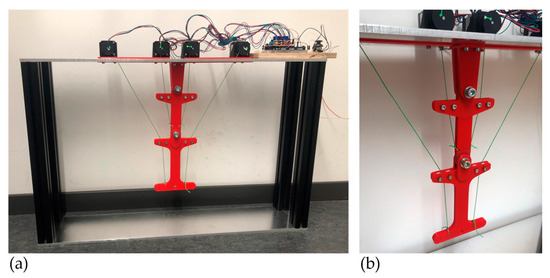 Since a kinematically determined actuator system is investigated in this paper, two rope pulls would be required for the two arm segments, and thus, requiring two degrees of freedom. Since ropes can only transfer tensile but not compressive forces, each arm segment also needs a rope on the opposite side to be able to move in positive and negative angular directions, which means that there are four rope pulls. This is analogous to the agonist/antagonist drive principle described in Section 3.1.2. The ropes are controlled by stepper motors, so that each individual “tension chording” can act individually. The final manufactured demonstrator is shown in Figure 8.
