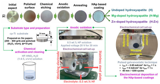 Details regarding the sample preparation and the electrochemical deposition of the coatings, namely, the preparation of the cp-Ti substrate nanostructured with titanium dioxide nanotubes (NTs) uncoated and coated with osteoconductive HAp-based coatings are available in Refs. [57,58]. A succinct overview of the biofunctionalization phases and the key variables are shown in Figure 1. Figure 1 also shows the macroscopic aspect of the samples following each step of preparation.
