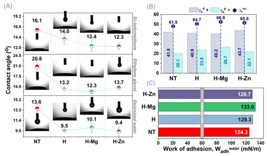 Figure 2C presents the work of adhesion (Wadh) values for water obtained for the investigated surfaces. It is known that a Wadh higher than 60 mN/m [75] favors adequate tissue adhesion to the surface of an implantable device. Moreover, the SFE of sanguine plasma is 52 mN/m [76], while the one for saliva can vary between 53.4 mN/m and 63.2 mN/m [77,78]. As a result, it is evident that the investigated surfaces—NT uncoated and coated with HAp undoped and doped with Mg or Zn—have values higher than 60 mN/m, indicating that biological fluids from the environment adjacent to implantable medical devices may easily wet them.