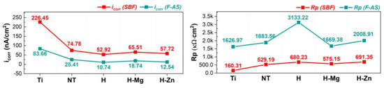 Table 5 highlights that the HAp-based coatings improved the electrochemical behavior of the nanostructured surfaces by exhibiting lower values of the corrosion current densities (icorr) in comparison with the nanostructured surface (NT), indicating that the coatings have a protective character, irrespective of the electrolyte’s type. Notably, all HAp-based coatings exhibit higher values of the polarization resistance (Rp) parameter.