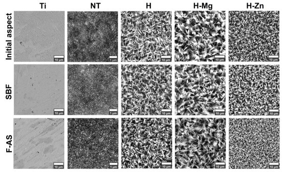 Following the electrochemical tests, the investigated materials were morphologically analyzed with a scanning electron microscope (Figure 5), which revealed that the developed materials do not show significant changes regardless of the testing medium, SBF or F-AS.