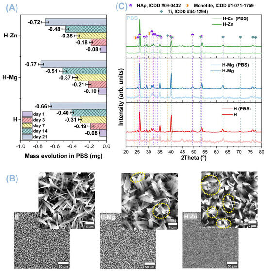 The increased surface free energy of the coatings doped with Mg or Zn (H-Mg, γstot = 66.9 mN/m; H-Zn, γstot = 65.8 mN/m) compared with HAp (H, γstot = 64.7 mN/m) may explain the increase in biomineralization capacity. However, in the case of HAp-based coatings doped with Mg or Zn, this assertion must be coupled with Mg’s increased biodegradability, in comparison with Zn, which leads H-Mg coatings to have a slightly lower biomineralization capacity than H-Zn coatings.